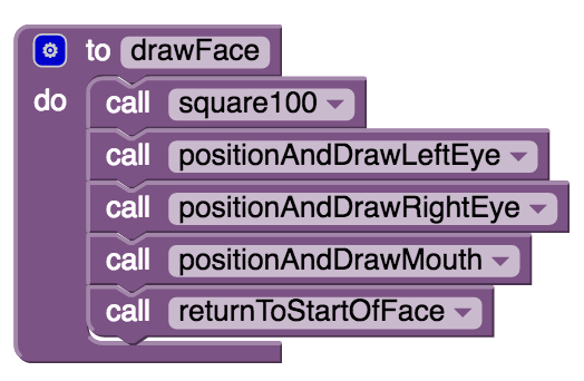 As their names advise, the sub-procedures will include the various penUp, penDown, and movement commands to position the optics and oral fissure correctly and to return the Android to its starting position (at the bottom left corner of the face). Recollect: Ideally, your algorithms should get out the Android in the same state when it is finished drawing the head equally when information technology started.To drawFace practice: square100 positionAndDrawLeftEye positionAndDrawRightEye positionAndDrawMouth returnToStartOfFace
