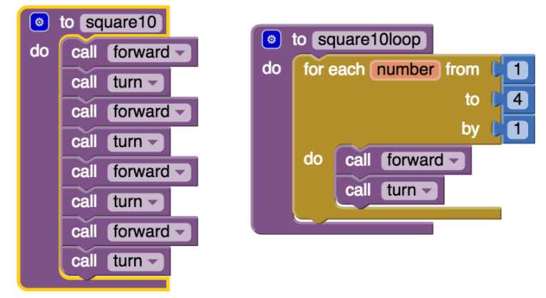 There are three basic types of control structures in designing algorithms: sequence, selection, and repetition. But most any algorithm you can call up of can be built using these three types of controls. Equally you lot saw in the tutorial, procedures and loops made drawing a square much easier than using a list of commands. Note the big divergence between the 2 algorithms below. The algorithm on the left uses a elementary sequence with copies of the forward and turn blocks to depict a foursquare, whereas the algorithm on the right uses repetition, a for-each counting loop, a much more applied and general approach. The for-each block in this case repeats the statements in its practise-slot iv times.